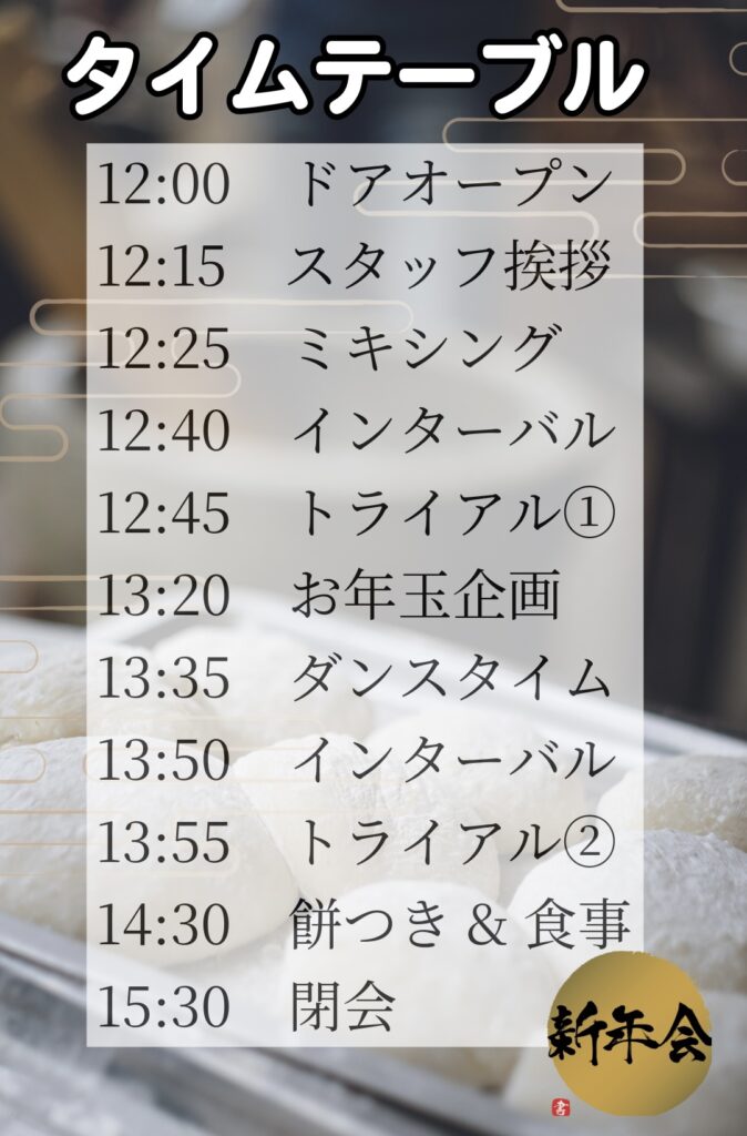 2026年1月17日(土) 新年会のタイムテーブルをご案内いたします。