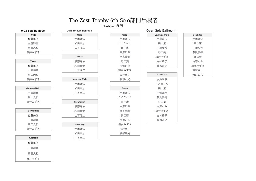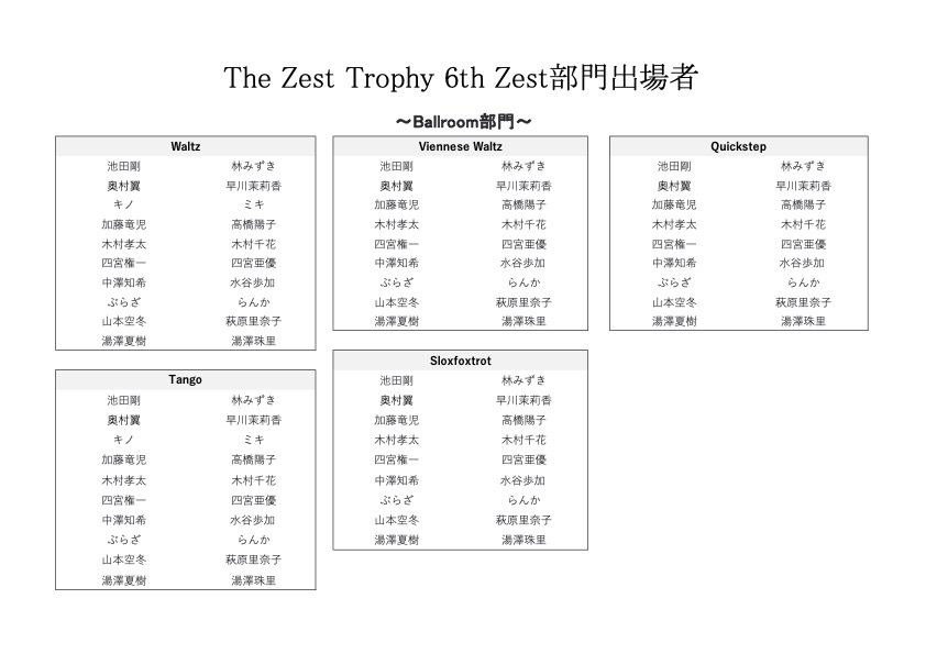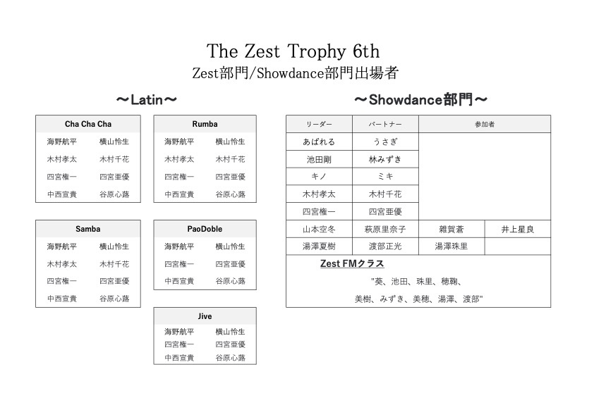 公式情報 The Zest Trophy 6th のタイムテーブル 関連記事 ★The Zest Trophy 3rd ご協賛企業様ご紹介②★ 2024-07-12 6月の休業日のお知らせ 2025-06-04 【御礼】The Zest 3rd Anniversary 〜Ryugu〜 2025-08-06 5月のグループレッスン表 2025-05-08 The Zest Trophy 6th のタイムテーブル 2026-01-19 The Zest Trophy 2nd 御協賛企業 2023-12-27 11/25 Winter Home Party 2023-09-06 2024!今年の漢字by The Zest Staff 2024-12-25